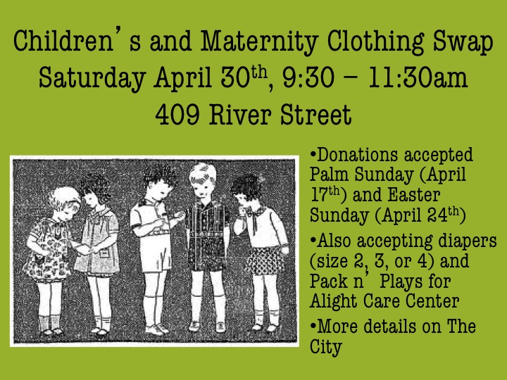 We will be accepting donations before and after both services on Sunday April 17th (Palm Sunday) and Sunday April 24th (Easter Sunday) at 409 River Street. Donations can also be dropped off during the week at 409 River Street. (Please call ahead to be sure someone who can let you in is there). Donated clothing should be contained in bags or plastic bins. Please label bins with your name so that they can be returned to you at the clothing swap. All children’s clothing and shoes from newborn to 5T in good condition (without stains or rips) will be accepted. Maternity clothing in good condition will also be accepted.