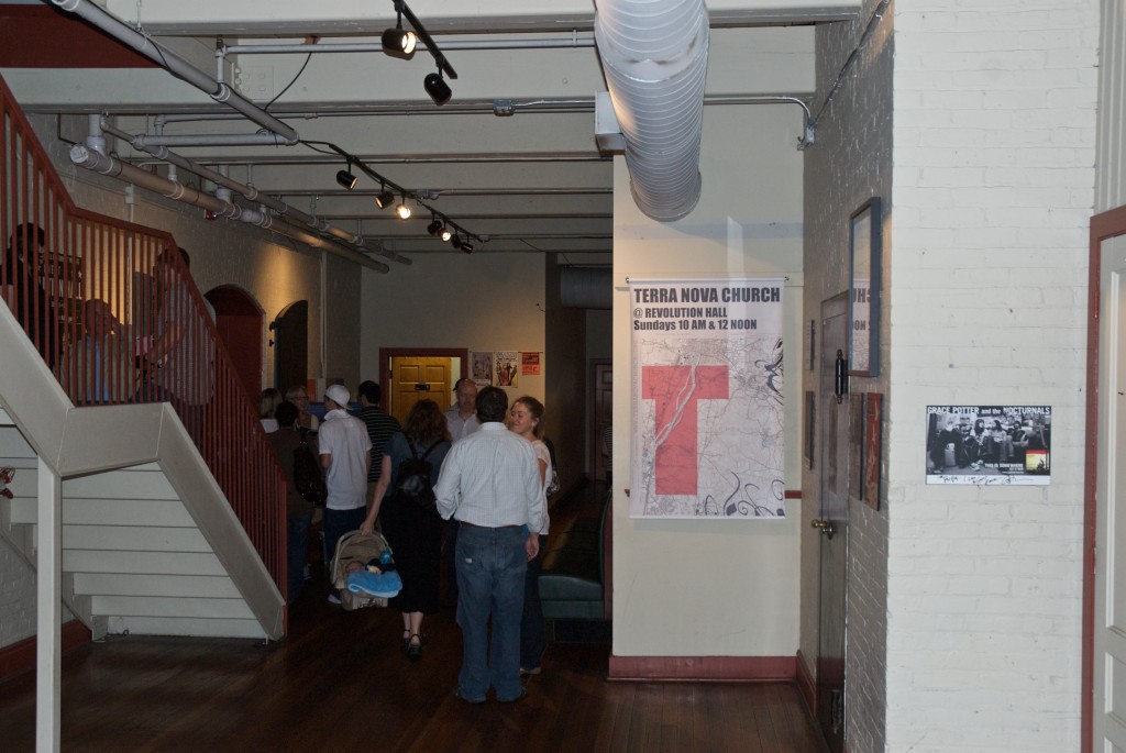 As you head up to River Street from your car, you’ll see a Terra Nova sign pointing you into Revolution Hall for worship. Go on in and find a seat. While you may notice the taps on the wall, the bar is unfortunately closed during the service. If you have kids, and you’d like to put them in Kids Church, you can just keep walking down River Street. Three doors down from Rev. Hall you’ll see another Terra Nova sign pointing you into our Education building. Our kids classes, offices and gallery space can be found in there. A security assistant will check you and your children in at the front door and you’ll be shown to the appropriate classroom. If there are any issues during the service, your cell phone will be buzzed by your child’s teacher. Full information about Terra Nova Kids can be found on the Terra Kids page of this site.